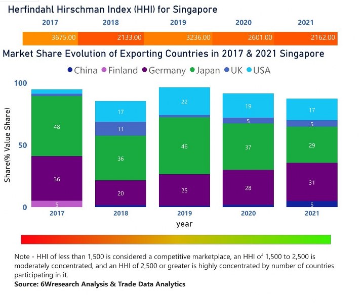 In the year 2021, Germany was the largest exporter in terms of value, followed by Japan. It has registered a decline of -21.21% over the previous year. While Japan registered a decline of -43.83% as compare to the previous year. In the year 2017 Japan was the largest exporter followed by Germany. In term of Herfindahl Index, which measures the competitiveness of countries exporting, Singapore has the Herfindahl index of 3675 in 2017 which signifies high concentration also in 2021 it registered a Herfindahl index of 2162 which signifies moderately concentrated in the market.