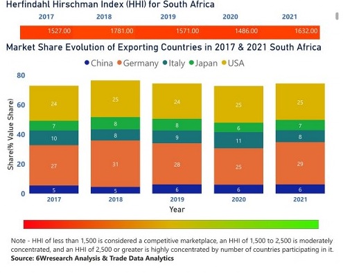 In the year 2021, Germany was the largest exporter in terms of value, followed by the USA. It has registered a growth of 50.07% over the previous year. While the USA registered a growth of 28.04% as compared to the previous year. In the year 2017, Germany was the largest exporter followed by the USA. In terms of the Herfindahl Index, which measures the competitiveness of countries exporting, South Africa has a Herfindahl index of 1527 in 2017 which signifies moderately concentrated also in 2021 it registered a Herfindahl index of 1632 which signifies moderately concentrated in the market.
