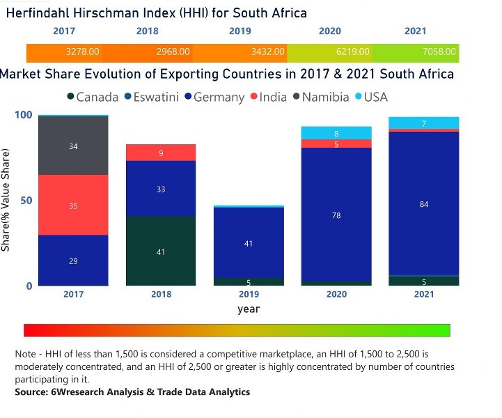 In the year 2021, Germany was the largest exporter in terms of value, followed by USA. It has registered a growth of 25.48% over the previous year. While USA registered a growth of 7.91% as compare to the previous year. In the year 2017 India was the largest exporter followed by Namibia. In term of Herfindahl Index, which measures the competitiveness of countries exporting, South Africa has the Herfindahl index of 3278 in 2017 which signifies high concentration also in 2021 it registered a Herfindahl index of 7058 which signifies high concentration in the market.