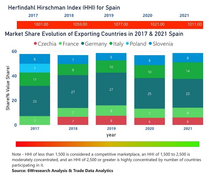 In the year 2021, Germany was the largest exporter in terms of value, followed by Italy. It has registered a growth of 17.56% over the previous year. While Italy registered a growth of 62.35% as compare to the previous year. In the year 2017 Germany was the largest exporter followed by Italy. In term of Herfindahl Index, which measures the competitiveness of countries exporting, Spain has the Herfindahl index of 1001 in 2017 which signifies high competitiveness also in 2021 it registered a Herfindahl index of 1011 which signifies high competitiveness in the market.