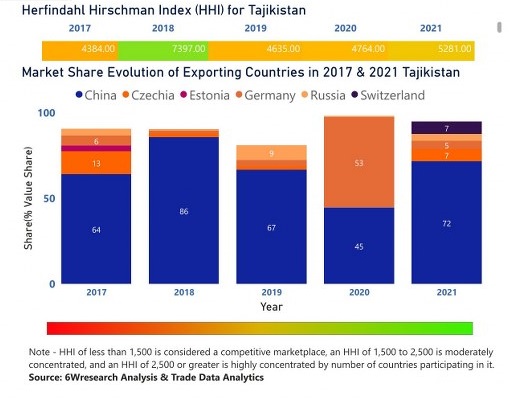 In the year 2021, China was the largest exporter in terms of value, followed by Czechia. It has registered a decline of -56.14% over the previous year. While Czechia registered a growth of 1377.82% as compare to the previous year. In the year 2017 China was the largest exporter followed by Czechia. In term of Herfindahl Index, which measures the competitiveness of countries exporting, Tajikistan has the Herfindahl index of 4384 in 2017 which signifies high concentration also in 2021 it registered a Herfindahl index of 5281 which signifies high concentration in the market.