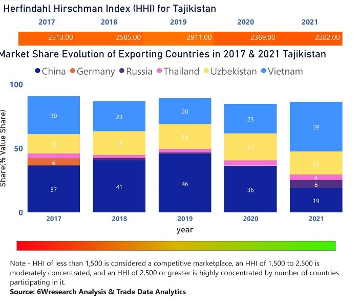 In the year 2021, Viet Nam was the largest exporter in terms of value, followed by China. It has registered a growth of 143.97% over the previous year. While China registered a decline of -23.4% as compare to the previous year. In the year 2017 China was the largest exporter followed by Viet Nam. In term of Herfindahl Index, which measures the competitiveness of countries exporting, Tajikistan has the Herfindahl index of 2513 in 2017 which signifies high concentration also in 2021 it registered a Herfindahl index of 2282 which signifies moderately concentrated in the market.
