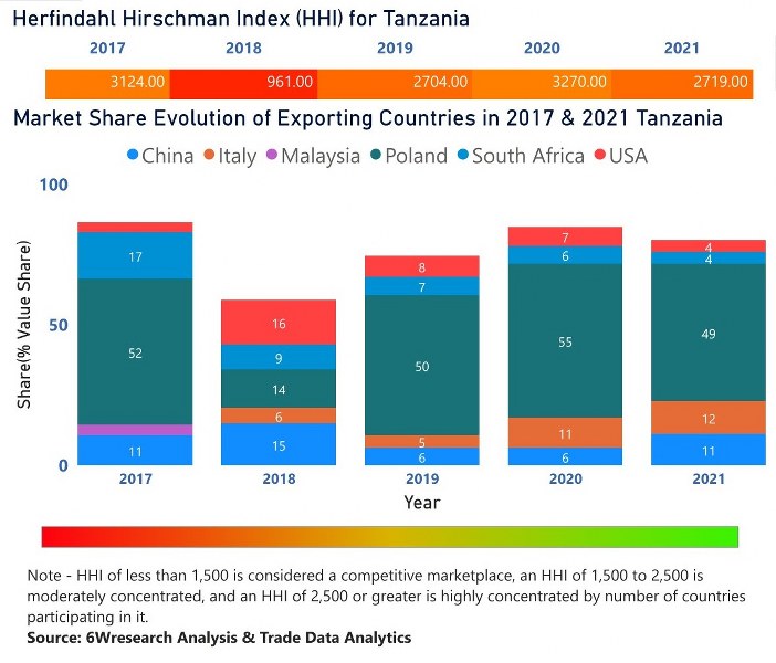 In the year 2021, Poland was the largest exporter in terms of value, followed by Italy. It has registered a decline of -12.47% over the previous year. While Italy registered a growth of 7.13% as compare to the previous year. In the year 2017 Poland was the largest exporter followed by South Africa. In term of Herfindahl Index, which measures the competitiveness of countries exporting, Tanzania has the Herfindahl index of 3124 in 2017 which signifies high concentration also in 2021 it registered a Herfindahl index of 2719 which signifies high concentration in the market.