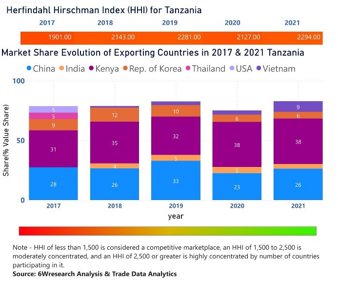 In the year 2021, Kenya was the largest exporter in terms of value, followed by China. It has registered a growth of 10.24% over the previous year. While China registered a growth of 28.85% as compare to the previous year. In the year 2017 Kenya was the largest exporter followed by China. In term of Herfindahl Index, which measures the competitiveness of countries exporting, Tanzania has the Herfindahl index of 1901 in 2017 which signifies moderately concentrated also in 2021 it registered a Herfindahl index of 2294 which signifies moderately concentrated in the market.