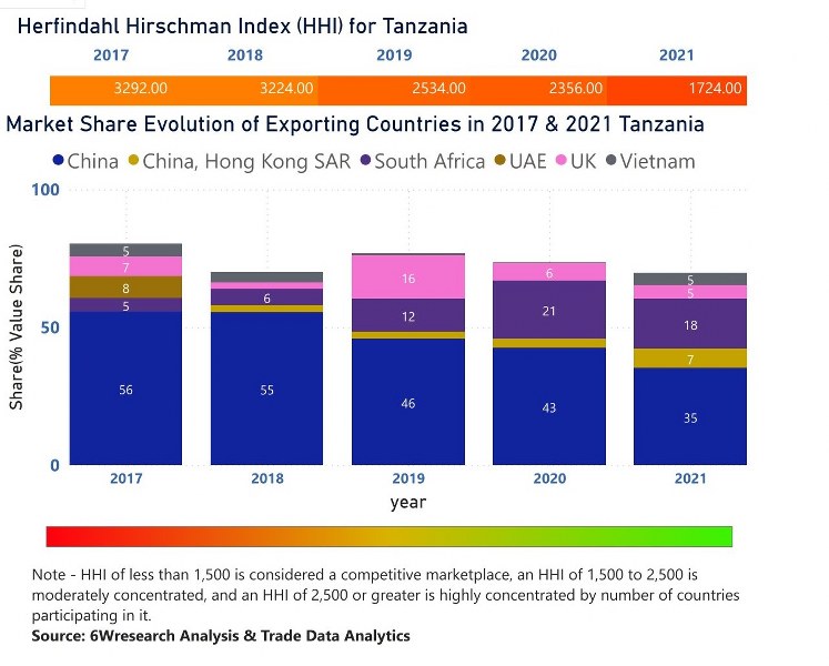 In the year 2021, China was the largest exporter in terms of value, followed by South Africa. It has registered a decline of -10.26% over the previous year. While South Africa registered a decline of -6.46% as compare to the previous year. In the year 2017 China was the largest exporter followed by UAE. In term of Herfindahl Index, which measures the competitiveness of countries exporting, Tanzania has the Herfindahl index of 3292 in 2017 which signifies high concentration also in 2021 it registered a Herfindahl index of 1724 which signifies moderately concentrated in the market.