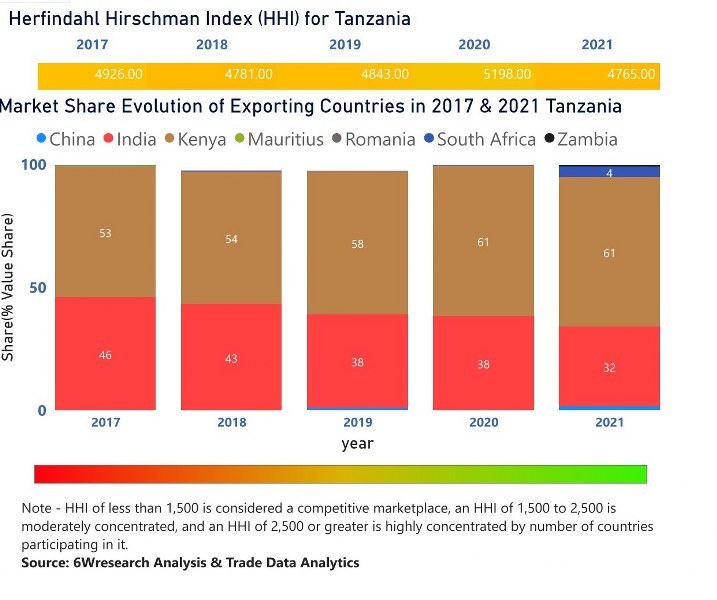 In the year 2021, Kenya was the largest exporter in terms of value, followed by India. It has registered a growth of 40.03% over the previous year. While India registered a growth of 18.32% as compare to the previous year. In the year 2017 Kenya was the largest exporter followed by India. In term of Herfindahl Index, which measures the competitiveness of countries exporting, Tanzania has the Herfindahl index of 4926 in 2017 which signifies high concentration also in 2021 it registered a Herfindahl index of 4765 which signifies high concentration in the market.