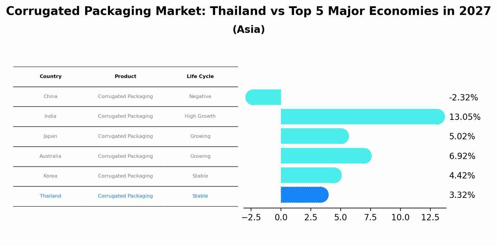 By 2027, Thailand's Corrugated Packaging market is forecasted to achieve a stable growth rate of 3.32%, with China leading the Asia region, followed by India, Japan, Australia and South Korea.