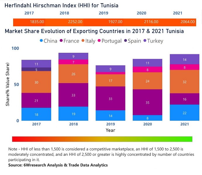 In the year 2021, Italy was the largest exporter in terms of value, followed by China. It has registered a growth of 59.83% over the previous year. While China registered a growth of 242.35% as compare to the previous year. In the year 2017 Italy was the largest exporter followed by France. In term of Herfindahl Index, which measures the competitiveness of countries exporting, Tunisia has the Herfindahl index of 1835 in 2017 which signifies moderately concentrated also in 2021 it registered a Herfindahl index of 2064 which signifies moderately concentrated in the market.