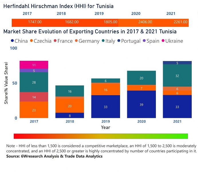 In the year 2021, China was the largest exporter in terms of value, followed by Italy. It has registered a decline of -11.41% over the previous year. While Italy registered a growth of 64.54% as compare to the previous year. In the year 2017 Italy was the largest exporter followed by Czechia. In term of Herfindahl Index, which measures the competitiveness of countries exporting, Tunisia has the Herfindahl index of 1747 in 2017 which signifies moderately concentrated also in 2021 it registered a Herfindahl index of 2261 which signifies moderately concentrated in the market.