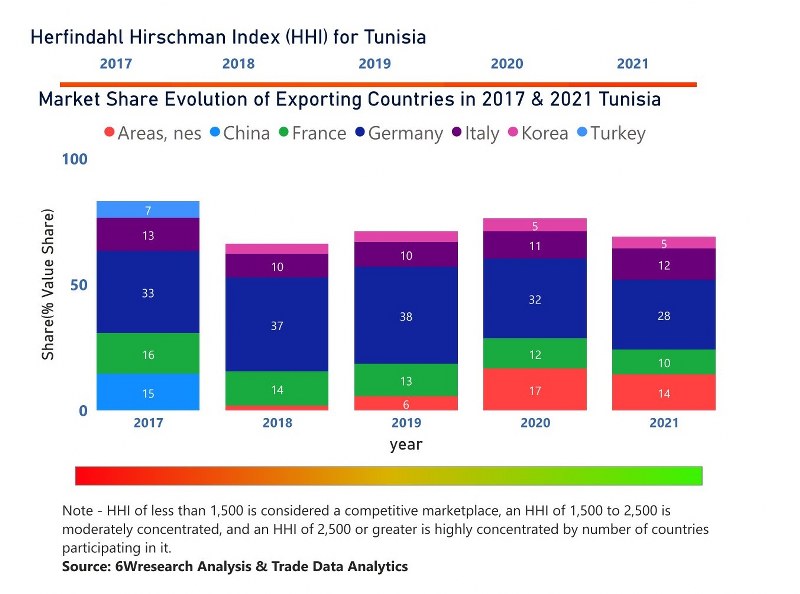 In the year 2021, Germany was the largest exporter in terms of value, followed by Areas, nes. It has registered a growth of 15.35% over the previous year. While Areas, nes registered a growth of 14.96% as compare to the previous year. In the year 2017 Germany was the largest exporter followed by France. In term of Herfindahl Index, which measures the competitiveness of countries exporting, Tunisia has the Herfindahl index of 1792 in 2017 which signifies moderately concentrated also in 2021 it registered a Herfindahl index of 1322 which signifies high competitiveness in the market.