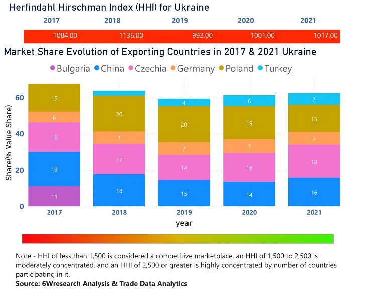 In the year 2021, Czechia was the largest exporter in terms of value, followed by China. It has registered a growth of 29.9% over the previous year. While China registered a growth of 34.92% as compare to the previous year. In the year 2017 China was the largest exporter followed by Czechia. In term of Herfindahl Index, which measures the competitiveness of countries exporting, Ukraine has the Herfindahl index of 1084 in 2017 which signifies high competitiveness also in 2021 it registered a Herfindahl index of 1017 which signifies high competitiveness in the market.