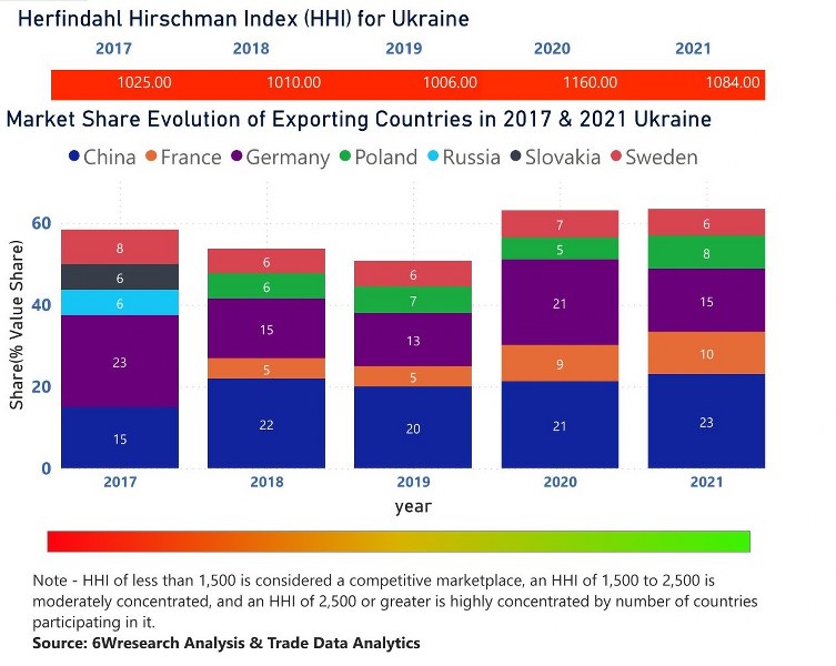 In the year 2021, China was the largest exporter in terms of value, followed by Germany. It has registered a growth of 15.74% over the previous year. While Germany registered a decline of -21.23% as compare to the previous year. In the year 2017 Germany was the largest exporter followed by China. In term of Herfindahl Index, which measures the competitiveness of countries exporting, Ukraine has the Herfindahl index of 1025 in 2017 which signifies high competitiveness also in 2021 it registered a Herfindahl index of 1084 which signifies high competitiveness in the market.