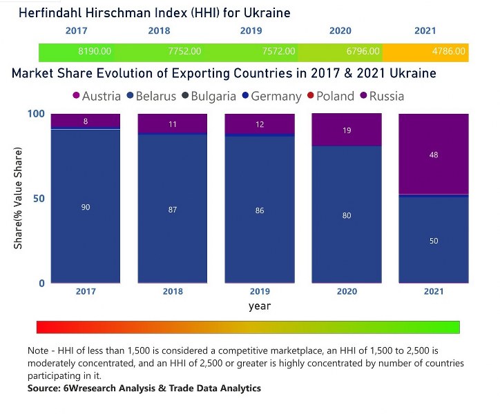 In the year 2021, Belarus was the largest exporter in terms of value, followed by Russia. It has registered a decline of -45.36% over the previous year. While Russia registered a growth of 119.72% as compare to the previous year. In the year 2017 Belarus was the largest exporter followed by Russia. In term of Herfindahl Index, which measures the competitiveness of countries exporting, Ukraine has the Herfindahl index of 8190 in 2017 which signifies high concentration also in 2021 it registered a Herfindahl index of 4786 which signifies high concentration in the market.