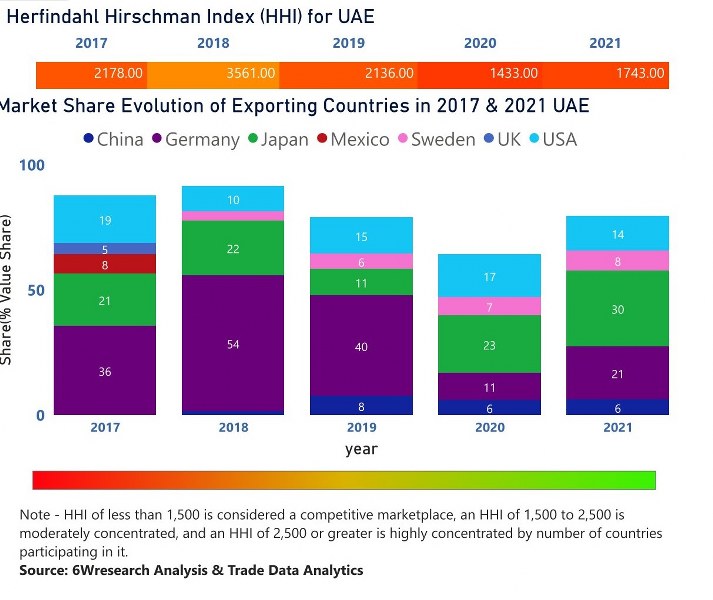 In the year 2021, Japan was the largest exporter in terms of value, followed by Germany. It has registered a growth of 62.78% over the previous year. While Germany registered a growth of 144.39% as compare to the previous year. In the year 2017 Germany was the largest exporter followed by Japan. In term of Herfindahl Index, which measures the competitiveness of countries exporting, UAE has the Herfindahl index of 2178 in 2017 which signifies moderately concentrated also in 2021 it registered a Herfindahl index of 1743 which signifies moderately concentrated in the market.