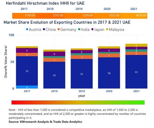 In the year 2021, China was the largest exporter in terms of value, followed by Germany. It has registered a growth of 41.4% over the previous year. While Germany registered a growth of 10.07% as compare to the previous year. In the year 2017 China was the largest exporter followed by Japan. In term of Herfindahl Index, which measures the competitiveness of countries exporting, UAE has the Herfindahl index of 3190 in 2017 which signifies high concentration also in 2021 it registered a Herfindahl index of 4056 which signifies high concentration in the market.