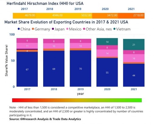 In the year 2021, China was the largest exporter in terms of value, followed by Viet Nam. It has registered a growth of 4.24% over the previous year. While Viet Nam registered a growth of 104.47% as compare to the previous year. In the year 2017 China was the largest exporter followed by Mexico. In term of Herfindahl Index, which measures the competitiveness of countries exporting, USA has the Herfindahl index of 4679 in 2017 which signifies high concentration also in 2021 it registered a Herfindahl index of 2718 which signifies high concentration in the market.
