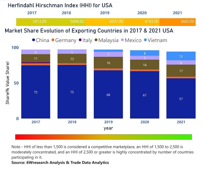 In the year 2021, China was the largest exporter in terms of value, followed by Malaysia. It has registered a growth of 1.58% over the previous year. While Malaysia registered a growth of 45.13% as compare to the previous year. In the year 2017 China was the largest exporter followed by Malaysia. In term of Herfindahl Index, which measures the competitiveness of countries exporting, USA has the Herfindahl index of 5813 in 2017 which signifies high concentration also in 2021 it registered a Herfindahl index of 3683 which signifies high concentration in the market.